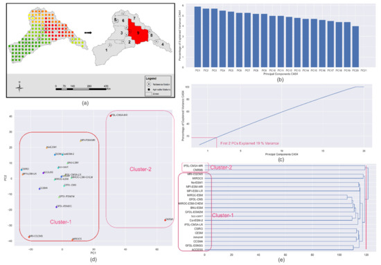- After combining the data of 21 GCMs for the historical and projected periods for RCP 4.5 and RCP 8.5 for all the reference stations, Principal Component Analysis (PCA) was performed on 21 GCMs data at each of the reference stations. The objective was to reduce the dimensions of the large matrix of the daily time series of 129 years (base period: 1971–2004 and projected period: 2005–2099) for the reference stations in each of the climate zone of every season. In addition, to retain as much descriptive of the data as possible, PCA enabled us to reduce such a large matrix into a smaller-sized matrix. The Principal Components (PCs) were obtained using the data of 21 GCMs at each of the reference stations. The highly ranked PCs which explained maximum cumulative variance in the dataset were identified through the scree plot. The component scores are derived by eigenvectors and the eigenvalues for all the GCMs in each PC. These component scores represent climate change patterns/signals in that specific site and may be considered an alternative to the meteorological parameters, which are statistically independent [14,55]. Figure 3b,c are the scree plot showing the percentage of explained variance by individual GCM and the line plot representing the cumulative percentage of explained variance, respectively. The variance explained by the individual PCs as shown in Figure 3b ranges between 4 and 6%, which means that all the PCs are equally important in deciding the hierarchy of the clusters of the GCMs for this zone 9 of the cold dry season. The gradient of the line plot in Figure 3c depicts that 18 PCs have explained the cumulative variance of 90%. All principal components have been included for the agglomerative hierarchical clustering to accommodate the maximum variance of the data. Figure 3d presents the scatter of the component scores of all the GCMs for the first two PCs, which cumulatively explained 19% variance in the data at the reference station of climate zone 9. The dendrogram tree is presented in Figure 3e, which presents the agglomerative hierarchical clustering of the GCMs for this climate zone.