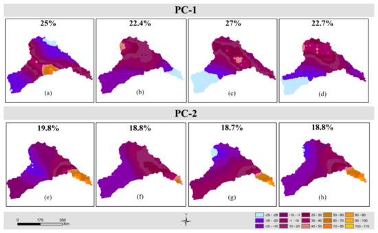 The spatial distribution of the component scores for the first two principal components (PC), percentage variance explained by the PCs are written in each panel (a) warm-wet (PC1), (b) cold dry (PC1), (c) cold wet (PC1), (d) warm dry (PC1), (e) warm wet (PC2), (f) cold dry (PC2), (g) cold wet (PC2) and (h) warm dry (PC2) seasons.