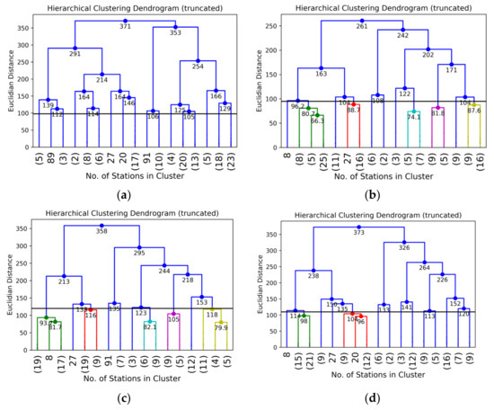 The maximum Euclidian distances were determined as 98, 95, 120, and 110, corresponding to the optimal number of clusters of 17, 11, 10, 14 for warm wet, cold dry, cold wet, and warm dry seasons, respectively. The dendrogram trees, as shown in Figure 6, were obtained through AHC. These trees were truncated at maximum Euclidian distances of 98, 95, 120, and 110 to obtain the optimum number of clusters and the station points in every cluster. The truncation bar in each season is also shown in Figure 6.