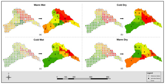 The transition of clusters into Climate zones in the study area in the (a) warm wet, (b) cold dry, (c) cold wet, and (d) warm dry seasons.