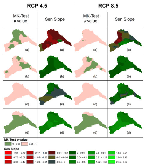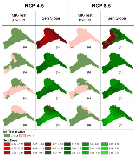 Mann Kendall trend detection and Sen’s slope results for MME-Mean using RCP 4.5 and RCP 8.5 for analysis period (2005–2099) (a) Warm Wet (b) Cold Dry (c) Cold Wet (d) Warm Dry.
