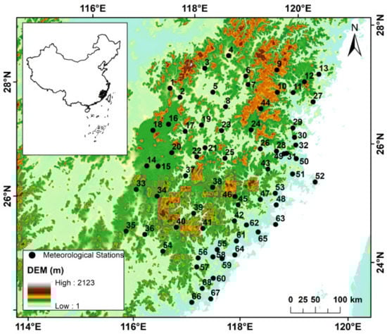 Extreme precipitation tends to trigger natural hazards such as floods, landslides, and debris flows that cause large human and economic losses []. The global increase in the frequency and intensity of extreme precipitation events has been observed in numerous studies [,,,]. Many previous studies showed that China experiences a significant increase in extreme precipitation, in particular northwestern and southeastern China, during the rainy season from April to September [,,,]. Fujian Province, located in the Southeastern Coastal Region of China (SEC), has a typical subtropical monsoon climate. It is an economically developed area with a high population density and a high concentration of wealth. However, natural disasters, such as floods, typhoons, and mountain torrents, often occur in this region. Based on preliminary statistics, more than 182 extreme precipitation events occurred in the Fujian Province, which caused more than 2000 deaths from 1950 to 2000 [].