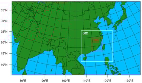 The WRF was continuously updated, and the latest version was 4.2.1 released in 2020. The version 3.8.1 of WRF was utilized in this study. Three domains with a grid spacing of 27 (d01), 9 (d02), and 3 km (d03) and domain sizes of 288 × 165, 211 × 208, and 220 × 232, respectively, were configured for the WRF simulation (Figure 2).