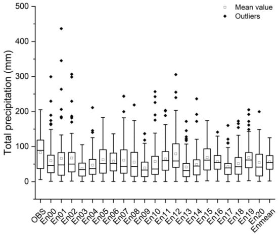 Total cumulative precipitation of all stations as well as the associated WRF ensembles. Thick horizontal lines in boxes showed the median values. Boxes indicated the inner-quartile (25% to 75%) and the whiskers showed the full range of the values. The hollow rectangles presented the mean values, and the solid diamonds presented the outliers.