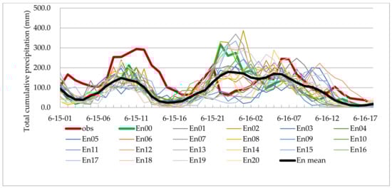 Figure 4 shows the temporal features of total cumulative precipitation by averaging 68 stations (red line), the GEFS ensemble control run (green line), and 20 ensemble members (thin lines), as well as the mean of ensembles (black line). For observation, the maximum TCP occurred at 11 UTC 15 June 2010 with a value of 294.3 mm. The minimum TCP was found at 18 UTC 16 June with only 11.6 mm. For WRF simulations, between 01 UTC to 21 UTC 15 June, the simulations were underestimated, especially the observed maximum TCP. The Enmean and the control run (En00) overestimated the TCP from 22 UTC 15 June to 03 UTC 16 June. The simulations fitted the observations quite well after 03 UTC 16 June.
