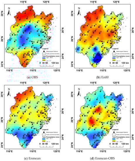 Figure 5d shows the bias distribution of interpolated Enmean compared to the observations (here Enmean minus observation). Thus, the negative value indicates that WRF underestimated observation, and the positive value represents an overestimation. The bias ranged from −203.1 to 112.3 mm. The largest underestimation was found in the central part of the province (Sanming City and Nanping City, which are in the Daiyun Mountains). The northern and southern Fujian Province was overestimated by WRF ensembles. The central part of Fujian Province was underestimated because of the complex terrains.