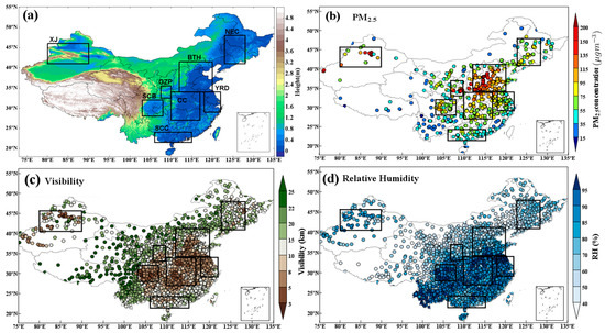 (a) The division of the eight regions including BTH, CC, GZP, NEC, SCB, SCC, YRD, and XJ; the spatial distribution of average (b) PM2.5 concentrations (μg m−3), (c) visibility (km), and (d) RH (%) from December 2016 to February 2017.