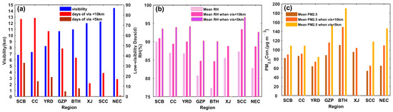 Severe low visibility events were observed in many areas of China during the winter of 2016–2017 [20,43]. The spatial distribution of average visibility, PM2.5 concentrations, and RH during this period is shown in Figure 1. It is clear that low visibility is mainly located in the central and eastern parts of China, including BTH, CC, GZP, SCB, and YRD (Figure 1c). The average visibility of the five regions ranked from low to high is SCB, CC, YRD, GZP, and BTH, respectively (Figure 2a). The lowest visibility is found in SCB (6.8 km), which is located in Southwest China. The counts of daily mean visibility of less than 10 and 5 km are 76 and 33 d, accounting for 84% and 37% of the study period, respectively. The average RH of the five regions ranked from high to low is SCB (90.0%), CC (86.9%), YRD (86.7%), GZP (80.7%), and BTH (77.3%) respectively (Figure 2b), which is consistent with the ascending order of visibility, suggesting that the higher the RH is, the lower the visibility is. Moreover, the mean RH under visibility <10 km in CC, SCB, and YRD is 89.6–90.9% and that under visibility <5 km is 93.5–94.2%. Mean RH under visibility <10 km in BTH and GZP is 84.6% and 86.8% and that under visibility <5 km is 90.0% and 90.3%, respectively. This also suggests the close relationship between low visibility (<5 km) and high RH (>90%).