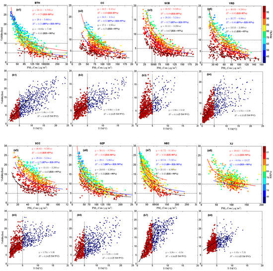 Scatterplots and fitting lines of 3-hourly visibility (km), (a1–a8) PM2.5 concentration (μg m−3), and (b1–b8) T-Td (°C) in the eight regions.