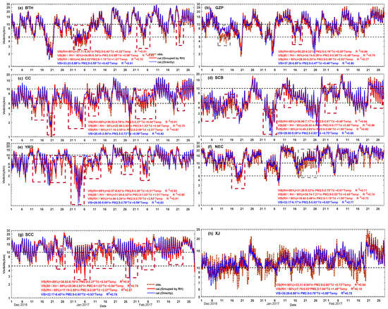 This work mainly uses the regression analysis method. The regression equations between 3-hourly visibility and PM2.5 concentrations under different RH levels during the winter of 2016–2017 (December 2016 to February 2017) were calculated to analyze the relationship between visibility, PM2.5 concentration, and ambient humidity. Considering the contribution differences of changes in PM2.5 concentration and humidity to visibility reduction, the 3-hourly data sets of the eight regions are grouped by different RH levels (BTH, GZP, and NEC: RH < 80%, 80 ≤ RH < 90% and RH ≥ 90%; CC, SCB, YRD, and SCC: RH < 85%, 85 ≤ RH < 95% and RH ≥ 95%; XJ: RH < 90% and RH ≥ 90%). Most sensors for measuring humidity have an uncertainty or systematic error. Therefore, it is considered that ambient humidity reaches saturation when the RH increases to >95% in this paper. Using these RH grouping methods, new multivariate nonlinear regression equations of PM2.5 concentration and humidity (represented by T and Td) on visibility of the eight regions are established. The calculated visibility in January 2016–2020 (except 2017), which was calculated by these visibility regression equations, are compared with the observations to evaluate the visibility forecasting capability of this visibility statistical algorithm.