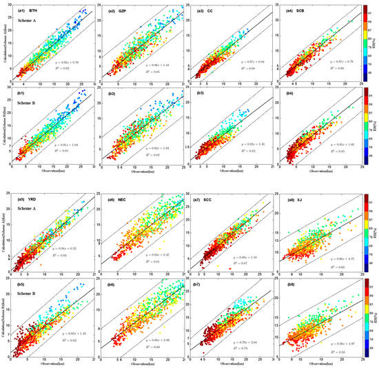In general, the calculated and observed visibility of BTH, GZP, CC, SCB, YRD, and SCC have similar trends. Numerically, Scheme A slightly overestimates the visibility from 2016 to 2020. The correlation coefficient between the observed and fitted visibility is 0.88–0.96, which all pass the significance t-test at the 0.01 level. Especially, MAE, MB, and RMSE under low visibility (<5 km) conditions are 0.44–1.41, −1.33–1.24, and 0.58–2.36 km, respectively. It suggests that Scheme A can well predict the low visibility in middle and eastern China. The correlation coefficient between the observed and calculated visibility of NEC and XJ is only 0.59–0.85, far lower than that in other regions. The worse visibility forecast ability in NEC and XJ may be due to the poorer fitting accuracy of their visibility fitting equations.