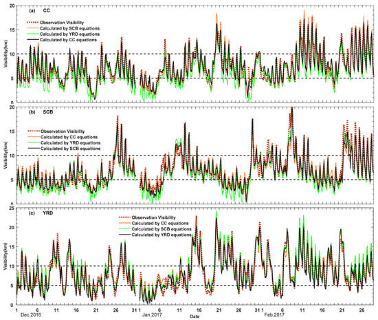Time series of 3-hourly observations (dashed lines, km) and calculated visibility (solid lines, km) of (a) CC, (b) SCB, and (c) YRD calculated by different fitting equations.
