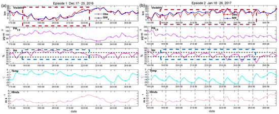 Time series of observed visibility (km), CALa (km), PM2.5 concentration (μg m−3), RH (%), temperature (°C), and wind speed (m s−1) in NEC during (a) Episode 1 and (b) Episode 2.