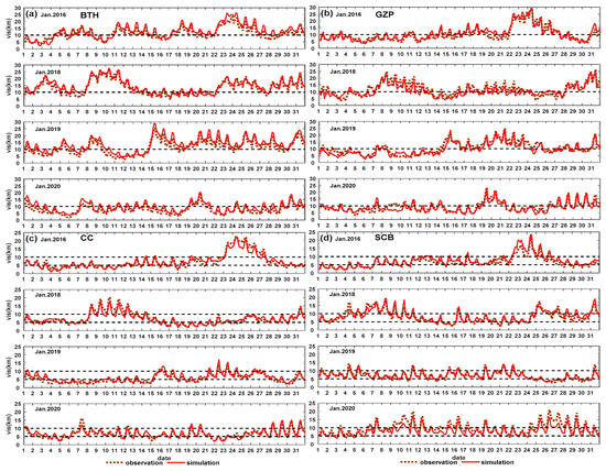 As it can be seen, during the winter of 2016–2017, the synoptic situations at heights of 500 and 850 hPa are dominated by the distinct zonal circulation, suggesting weak winds and stable atmospheric conditions in BTH, GZP, and NEC. The upper-level circulation situations in 2019 and 2020 are basically similar to those in the winter of 2016–2017. Accordingly, the calculated visibility in 2019 and 2020 calculated by Scheme A, which is based on data of winter 2016–2017, have good fitting degrees. However, there are large changes in synoptic situations in 2016 and 2018. The circulation patterns in the mid-troposphere in the two years are dominated by distinct meridional circulation, suggesting strong cold air activity and high wind speeds (Figure 9b) affecting northern and middle China. Correspondingly, the visibility in BTH, GZP, and NEC has not been well predicted in the two years. The strong meridional circulation has relatively smaller influences on the southern and eastern regions such as CC, SCB, YRD, and SCC. Thus the fitting degree of visibility in the four regions in 2016 and 2018 have no significant difference compared with that in 2019 and 2020. The results show that Scheme A performs better under similar circulation situations with the winter of 2016–2017. And this may be the main reason for the better visibility fitting degree in BTH, GZP, and NEC in 2019 and 2020.