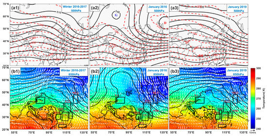 (a1–a3) Average geopotential height (solid lines, dagpm) and temperature (dashed lines, K) fields at 500 hPa height. (b1–b3) Average geopotential height (lines, dagpm), temperature (shading, K), and wind (arrows, m s−1) fields at 850 hPa height in winter of 2016–2017, January 2016, and January 2019.