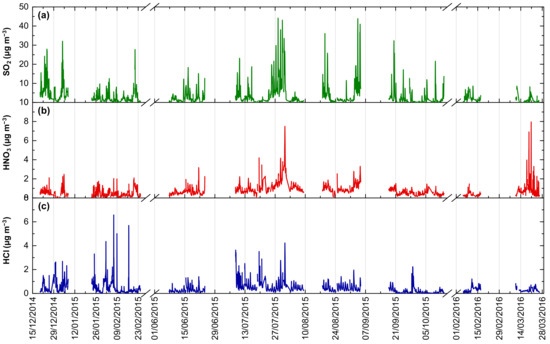 Nitric acid, hydrochloric acid, and sulfur dioxide (HNO3, HCl, and SO2, respectively) are the main atmospheric acidic gases that impact on the air quality and oxidative capacity of the atmosphere. HNO3 is produced during the day mainly via the reaction of nitrogen dioxide (NO2) with hydroxyl (OH) radicals [1]. Its nighttime formation includes the reaction of nitrate radicals (NO3)—formed by the reaction of O3 with NO2 that no longer photolyzes—with volatile organic compounds (VOC) and the heterogeneous hydrolysis of nitrogen pentoxide (N2O5) [2]. The heterogeneous reactions of NO3 radicals on particulates are considered of less importance compared to the other processes [3]. HNO3 formation is also involved in ozone (O3) production, thus serving as a sink for nitrogen oxides (NOx). Annual levels of few pptv to several ppbv of HNO3 might be encountered depending on the type of observation site, e.g., remote/clean versus urban/polluted conditions. HCl is emitted by the combustion of carbon- and chloride-containing fuels (e.g., solid waste combustion [4,5]), by water disinfection, and by manufacturing processes. It is also directly emitted by volcanoes, as well as by heterogeneous reactions on sea salt aerosol [6,7]. SO2 is one of the major products of fossil fuel combustion, which is further oxidized, both via gas-phase and/or heterogeneous reactions, into sulfuric acid (H2SO4) and subsequently into sulfate (SO42−) particles, with the latter acting as cloud condensation nuclei (CCN), thus affecting the radiative forcing of the atmosphere. SO2 can also be released by volcanoes or as a byproduct of the natural metabolism of dimethyl sulfide (DMS) in the marine environment [8].