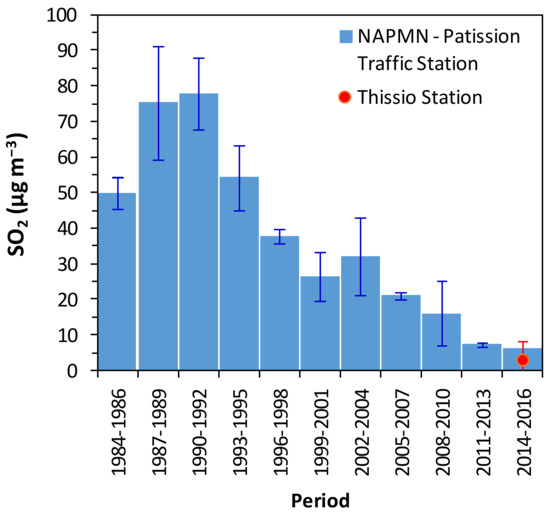 Furthermore, according to a climatological analysis [69] for the central, most polluted urban stations in Athens over the period of 1987–1997, a decrease of 52% in the SO2 levels at the Patission traffic station (located at one of the most congested streets of Attica) was reported between 1988–1990 and 1995–1997 (83 ± 4 μg m−3 and 40 ± 4 μg m−3, respectively) and is attributed to the application of abatement measures over the period of 1991–1994. The mean annual roadside levels of SO2 further decreased to about 14 μg m−3 in 2009 [70] and 8 μg m−3 in 2019 [71]. These additional reductions in SO2 levels can be attributed to the deindustrialization in the GAA and, on a national level, to the application of abatement measures and the reduction in emissions due to the recession after 2008 [72]. The mean level at about 3 μg m−3, observed at Thissio in 2014–2016, taking into account its standard deviation, falls within the range of the mean levels of 4–8 μg m−3 reported for the Patission station for the respective time period (Figure 2). Considering that the Patission station is located at one of the most congested streets of the GAA, the above agreement indicates the mostly regional character of SO2.