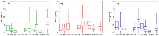 Mean seasonal variability of (a) SO2, (b) HNO3, and (c) HCl in Athens, Greece over the period 2014–2016. The boxes show the median and 25–75% range of the values, the whiskers are one standard deviation, and the mean is represented by the solid square.