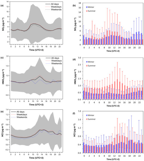 Mean diurnal variability of (a) SO2, (c) HNO3, and (e) HCl on an annual basis, including the mean of the weekdays and weekends, and for (b) SO2, (d) HNO3, and (f) HCl on a seasonal basis in Athens, Greece over the period 2014–2016. The area corresponds to ±1 standard deviation from the annual seasonal mean. Winter: December, January, and February. Summer: June, July, and August.