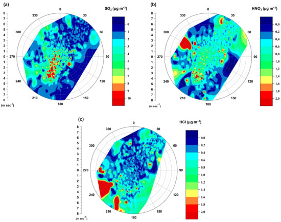 Polar graphs for the wind dependence of (a) SO2, (b) HNO3, and (c) HCl, on an annual basis, depicting the variability of the species relative to wind speed and wind direction. The color scale represents the concentration of individual components in μg m−3.