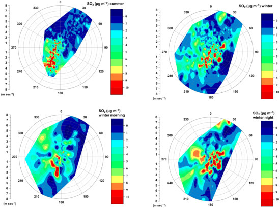 Polar graphs of SO2 during summer and winter (upper row) and during winter morning and winter nighttime (bottom row), depicting its variability relative to wind speed and wind direction. The color scale represents the concentration of individual components in μg m−3.