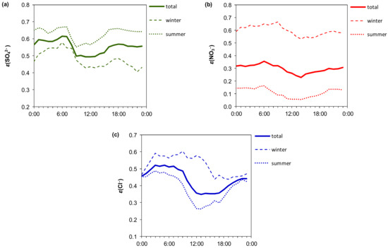Of great importance is the diurnal variability of the partitioning ratios presented in Figure 7a–c. For SO2, the particulate phase was calculated to be dominant during the summer, whereas during the winter both phases seemed to contribute equally. In both cases, a minimum is observed at noon, indicating the probable entrainment of SO2 during the development of the BL, with the mean noon minimum to maximum ε (SO42−) not varying more than 30% (Figure 7a).