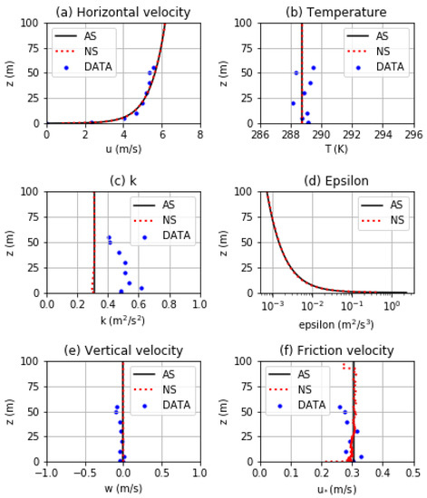 It can also be seen in Figure 3 that the numerical results match the observed u values, while differences with the observation data can be seen for both θ and k. For θ, the differences reflect simply that scatter existed in the observations, while the MOST profile of input to CFD was a smooth profile; k is discussed below.