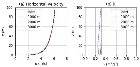 Figure 3 shows the results for the SBL at a position 2000 m from the upwind boundary. The MOST profiles of u and θ, which were applied as inlet conditions at the upwind boundary, are shown in Figure 3a,b, respectively. In both cases, the numerical results compare well with the MOST profiles. The reference profile of k, obtained by simulation, as described above, is shown in Figure 3c. The numerical solution of k matches its reference profile reasonably well. However, k took some distance to stabilize to the form in Figure 3c, although the variations were relatively small; but, thereafter, this form was maintained along the remaining length of the domain.