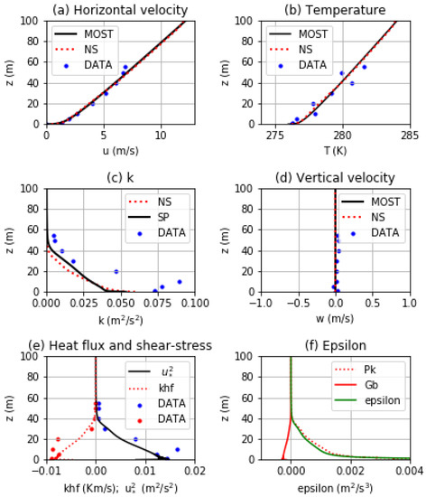 Furthermore, in Figure 1, it can be seen that the numerical results for u, θ, w, and friction velocity broadly agree with the respective CASES-99 measurements. However, the results underestimated the measured values for k, as shown in Figure 1c. Possible reasons for this are discussed below.