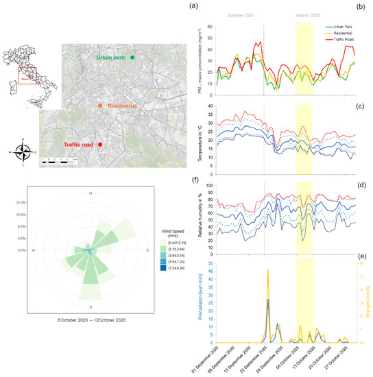 Overview of the three urban sites (Urban Park, Residential and Road Traffic) of Rome (a), PM10 mass concentration (b), three meteorological parameters (temperature, relative humidity and precipitation) (c–e) and wind conditions (speed and direction) (f), recorded during the sampling campaign of Early Autumn 2020 (yellow shaded area). For temperature and relative humidity, the solid lines represent the daily-averages (blue), the maxima (red) and the minima (dark blue). The standard deviations are reported as dashes lines.