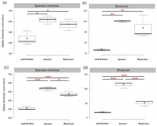 Statistical comparisons of OTUs richness (Species Richness, S*) and diversity (exponential of Shannon entropy, 1 D*) of bacterial (a,b) and fungal (c,d) communities across three types of samples, leaf surface of Q. ilex, aerosol (PM10) and road dust, collected in three urban sites of Rome. Pairwise comparisons of least square means were performed using Tukey’s HSD test, and the horizontal lines show significance levels between groups (* p < 0.05, ** p < 0.01, *** p < 0.001).
