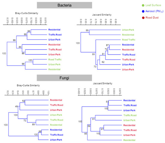 Compositional comparison of all sample types in a UPGMA (unweighted pair group method with arithmetic mean) non-hierarchical clustering ordination. Clusters are constructed from a Bray-Curtis similarity matrix of species-level-OTUs abundances and Jaccard similarity matrix of species-level-OTUs presences for bacteria and fungi, computed between aerosol (PM10), road dust and leaf surface samples collected in three urban sites of Rome (Urban Park, Residential and Road Traffic).
