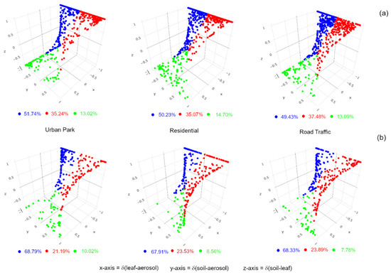 The reconstruction of source-sink relationships of aerosol (PM10)-associated microbial communities with microbes of Q. ilex leaf surface and road dust detected in the Urban Park, Residential and Road Traffic sites of Rome. Prevalence of each bacterial (a) and fungal (b) OTU in the airborne PM10 (blue dot), road dust (red dot), and leaf surface (green dot) was displayed by plotting the normalized-differences in the proportional abundances between leaf and aerosol samples δ(leaf-aerosol), between road dust and aerosol samples δ(soil-aerosol), and between road dust and leaf samples δ(soil-leaf) on the x, y and z axes, respectively. All OTUs at species-level detected in the aerosol (PM10)-associated microbial communities were included in each analysis.