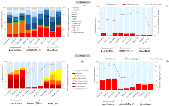 Percentage contribution of the extremotolerance (Ext) (a,b) and human-pathogenicity (c,d) associated with the bacterial and fungal species identified in three sample types, Leaf Surface, Aerosol (PM10) and Road Dust, collected in the Urban Park, Residential and Road Traffic sites of Rome. For bacteria: TAE = terrestrial and aquatic environments; SOI = soil; MFW = marine and fresh water; HAI = human, animal, and insect; PLANT = plant specific; OTHER = other.