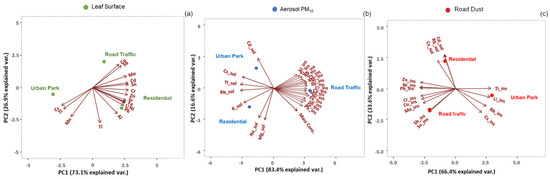 Principal Component Analysis of the selected elemental components detected in the three types of samples (a) leaf surface, (b) Aerosol PM10 and (c) Road Dust at the three sampling sites of Rome.