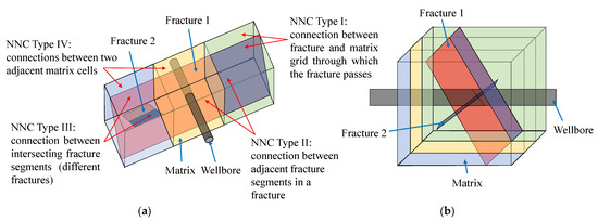 It can be seen from Equations (5) and (13) that the key to determining the specific discrete scheme of the flow equation of fracture units is to determine the transmissibility Tfij of fracture units, and the calculation of the geometric factor Gfij in the transmissibility is related to the connection relationship between fracture units. As shown in Figure 2, after dividing the fracture by matrix grid boundary, four types of Non-Neighboring Connection (NNC) in 3D-EDFM are formed, which are the connection between the fracture segment and the matrix grid through which the fracture section passes (NNC Type I), the connection between adjacent fracture segments in a fracture (NNC Type II), the connection between intersecting fracture segments (different fractures, NNC Type III), and the connection between two adjacent matrix cells (NNC Type IV). Introducing NNC pairs enables flow exchange between grids that are not only adjacent in the physical model but also adjacent in the computational model. The general calculation equation of the transmissibility coefficient of NNC is: