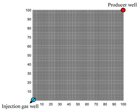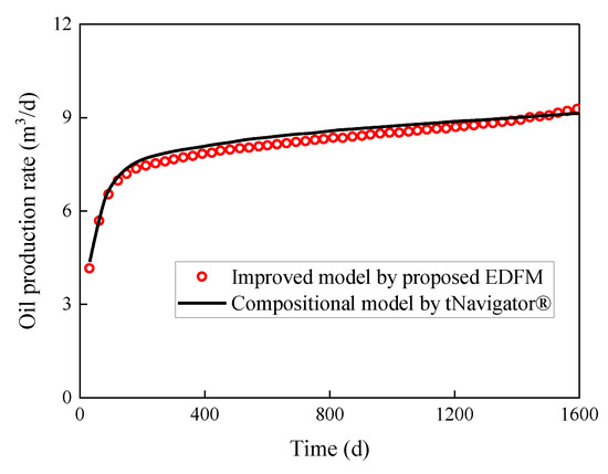 In our previous research [37], the accuracy of the proposed embedded discrete fracture modeling has been verified. Combined with the varying pressure-related fluid physical properties, the accuracy of the improved black oil model in this paper is compared with the compositional model from the advanced reservoir simulation software named tNavigator® for evaluating the injection of CO2. The values of parameters used in the simulation are shown in Table 2. Based on the physical scenario of one-well injection and one-well production (as shown in Figure 4), the reservoir pressure distribution of the improved model by our EDFM is consistent with that of the compositional model by tNavigator®, as indicated in Figure 5. Similarly, the results of well production performance between the two simulators are remarkably similar, as illustrated in Figure 6. The above verification shows that the model proposed in this paper can reflect dynamic characteristics affected by injecting CO2.