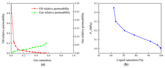 The relative permeability and capillary pressure curves in matrix. (a) The relative permeability curves. (b) The capillary pressure curve.