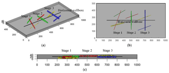 Sketch of 3D reservoir model with fracture cells and the horizontal wellbore. (a) 3D view. (b) Top view. (c) Main view.