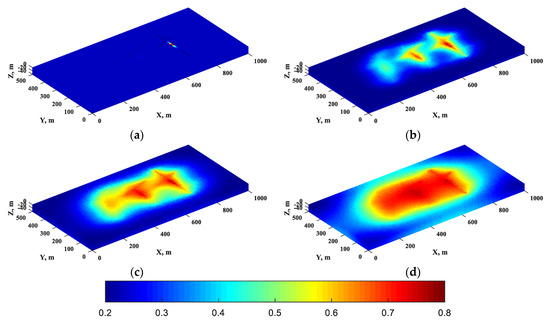 The CO2 saturation distribution map at different stages of multicycle CO2 huff-and-puff. (a) The start time. (b) After the 1st cycle. (c) After the 2nd cycle. (d) After the 3rd cycle.
