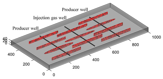 In this case, 3D-EDFM is applied for simulating the inter-fracture CO2 flooding between multiple wells. Figure 11 shows the sketch of three horizontal wells, of which one injection well is located in the middle of two production wells. The oil production and gas injection are carried out simultaneously. The bottom hole pressure is constantly controlled at 10 MPa and 30 MPa when it is producing and injecting, respectively. Figure 12 summarizes the plot of production dynamic curves of simulation of 1 year, and Figure 12a shows the dynamic change of gas injection rate. Figure 12b illustrates that the daily oil production considered CO2 flooding is higher than that of the natural depletion process without the effect of CO2 injection. In this model, the first fracture of the injection gas well is located in the first and second layers, and the second and third fractures are located in the third and fourth layers. The proposed 3D-EDFM can also be used to model the location of fractures in different layers, which is more consistent with the actual formation and engineering conditions. Figure 13 shows the CO2 saturation distribution map of simulation of 1 year at different layers. It can be seen that the injected CO2 will preferentially diffuse along the fracture and the diffusion area is not large enough because the simulated production time is relatively short. The effect of CO2 geological sequestration can be assessed by prolonging the production time because it is a long-term process. The extra significance of this model is that the asynchronous injection and production process can be stimulated by further controlling the open–shut time of wells, which is also worthy of attention in engineering applications.