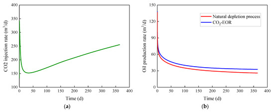 Production dynamic curves of inter-fracture CO2 flooding between multi-wells. (a) CO2 injection rate under constant pressure. (b) Oil production rate under constant pressure.