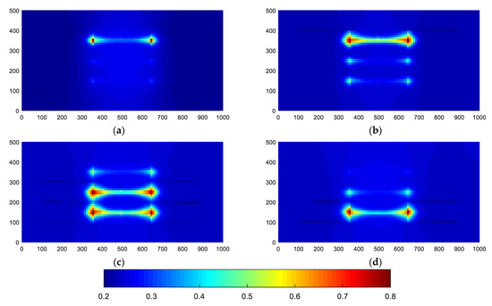 The CO2 saturation distribution map of simulation of 1 year at different layers. (a) The 1st layer. (b) The 2nd layer. (c) The 3rd layer. (d) The 4th layer.