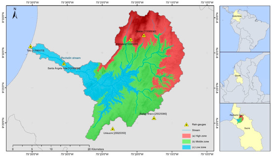 Characterization of the Arroyo Pechelín watershed: (a) (>250 m) high zone; (b) (100–250 m) middle zone; (c) (0–100 m) low zone.