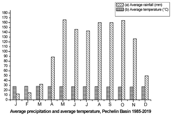 Average rainfall and average temperature, Pehelín basin 1985–2019: (a) average rainfall (mm); (b) average temperature (°C).