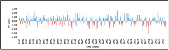 The SPI is frequently used for drought evaluation, the World Meteorological Organization considers the SPI as a universal drought index because of its capacity to be estimated for various reference periods adapting to the different response times of typical hydrological characteristics to precipitation [1]. Some investigations of the SPI as [2,3,4,5,6] show the practicality of the index to characterize drought events with few resources and at different time scales; this is an advantage over other methods of assessing drought. Although the SPI has been in existence for only a decade, it has been used with notable success in various applications, particularly in describing and monitoring drought conditions. It can be used as an indicator of drought severity or excessive wetness, and in the design of drought/flood contingency plans [7]. The SPI constitutes one of the basic elements to develop strategic planning, which allows the decision-making required in the medium and long term to efficiently face the different drought events that may arise [8].