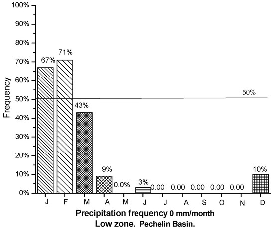 Precipitation frequency 0 mm/month in the low zone, Pechelín basin.