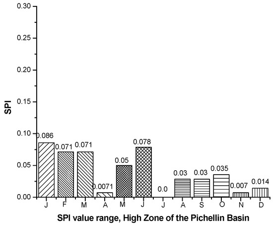 It is necessary to clarify that having zero precipitation (0 mm/month) in more than half of the available historical months should be an indication of meteorological drought. However, when calculating the SPI, these values rise, as can be seen in the low zone (January and February) concerning the months in which they have more precipitation (rest of the year). This condition can be observed in Figure 13.