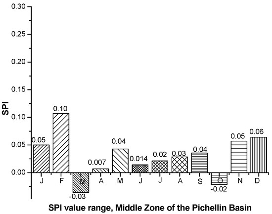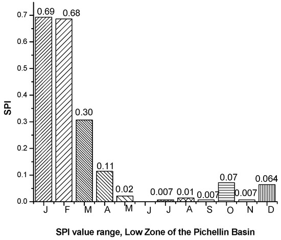 For each of the areas of the basin, the value of the monthly average SPI was determined through the analysis of data in the period between 1985 and 2019 grouped in monthly intervals. The upper and middle zone did not present extremely wet or dry values. However, for the lower zone, the months with less precipitation (January, February and March) were those that presented wet SPI values. This occurred due to the high frequency of zero-precipitation values in the months of January, February and March, as shown in Figure 11, Figure 12 and Figure 13.
