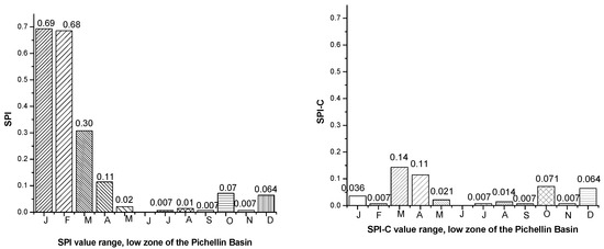 The SPI-C only corrected the values when there is zero monthly precipitation (0 mm/month) in more than half of the data. The SPI-C reduced the values for January in the low zone of the Pechelín basin from Z = 0.693 → Z = 0.036 and for the month of February from Z = 0.686 → Z = 0.007. These results obtained by the SPI-C better represent the high frequency of data with zero precipitation.